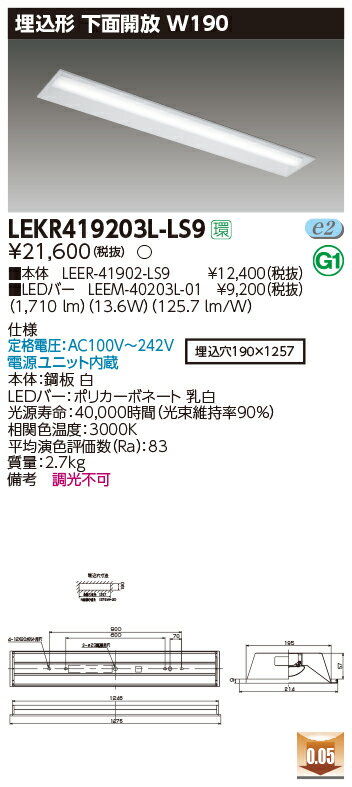 LED LEKR419203D-LS9 LEDベースライト (LEKR419203DLS9) TENQOO埋込40形W190 LEDベースライト