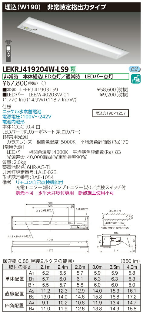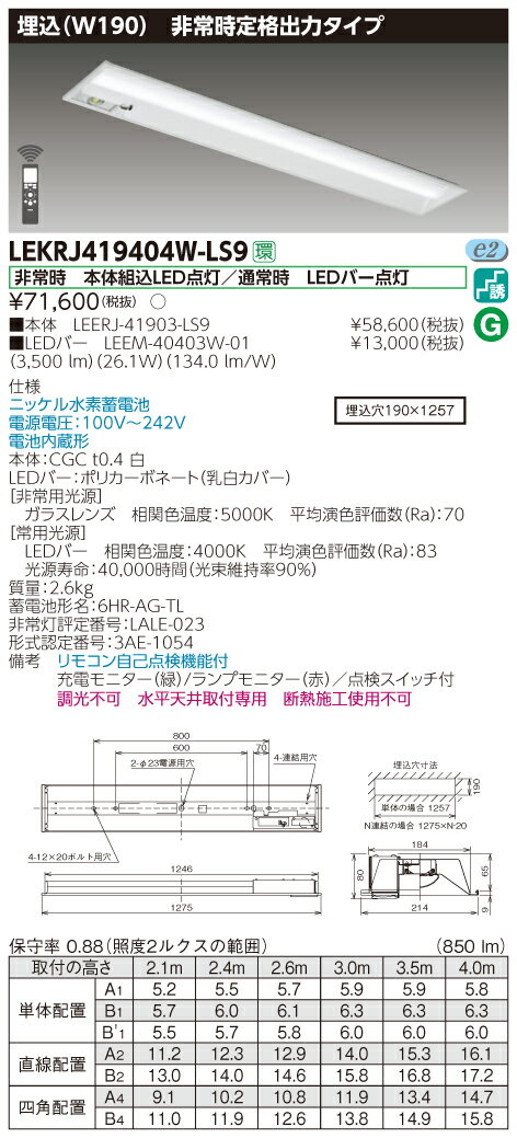 東芝 LEKRJ419254L-LS9 (LEKRJ419254LLS9) TENQOO非常灯40形埋込W190 LED組み合せ器具