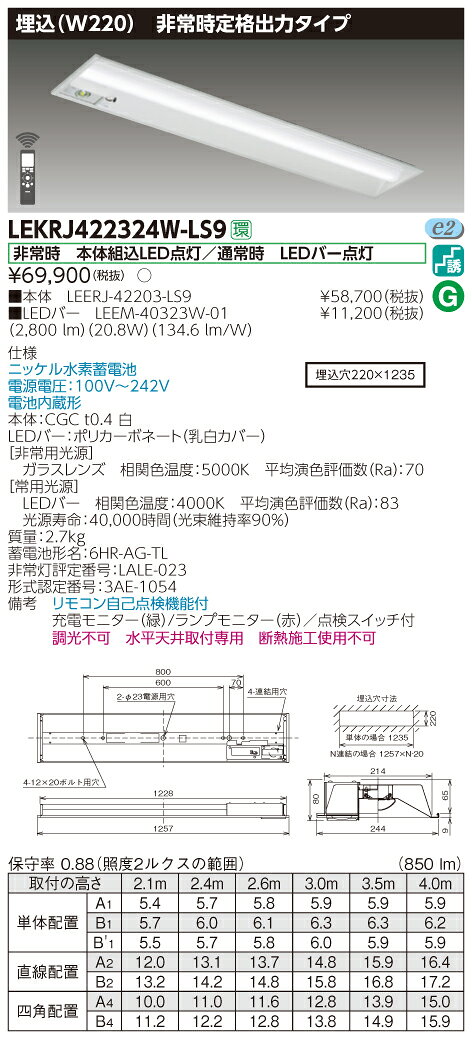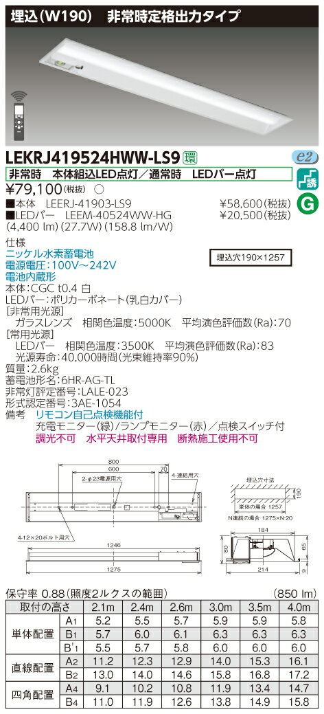 東芝 LEKRJ419524HWW-LS9 (LEKRJ419524HWWLS9) TENQOO非常灯40形埋込W190 LED組み合せ器具
