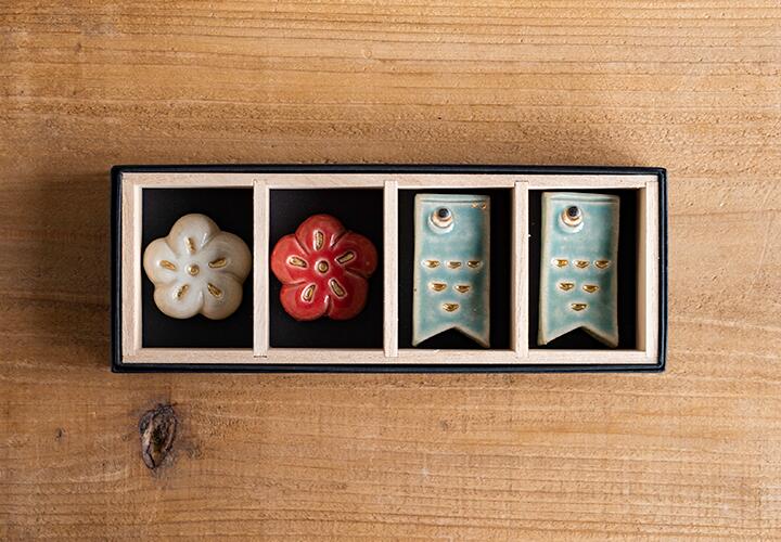 【ふるさと納税】【信楽焼】箸置き4点セット(紅白の桃2個、鯉のぼり2個)iwai-hashiokiB